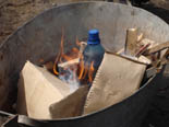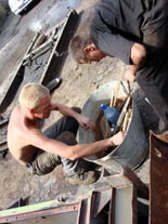 De Amur rivier scheidt Rusland van China en we zien aan de overkant duidelijk de gebouwen en mensen lopen van Sjisji. Rob, Marlies en Co zijn ook gearriveerd en we verbazen ons over de manier waarop de Russen het rek van Marlies gemaakt hebben: “Russian extreme techniek” lacht een Rus als hij ernaar kijkt. Het rek is niet fraai maar voldoet wel.