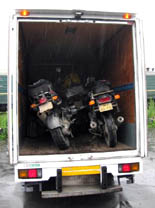 We brengen de motoren naar een loods en wachten een paar uur. Er gebeurt helemaal niets en we besluiten terug te gaan naar het hotel. Om 5 uur gaan we maar weer eens kijken en zien we nog net een kleine vrachtwagen met onze motoren richting trein vertrekken. We volgen de auto en belanden bij de wagon waar onze motoren in zullen worden vervoerd.