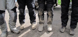 Terwijl ik een stuk verderop een plek zoek om te stoppen komen Cor en Ria al voorbij en ook zie ik John met zijn KTM. Waar is Joris met zijn Harley? Ik stop en wacht, maar Joris zie ik niet. Ik draai om en rij terug. Dan zie ik Hester, Leon en Ruud staan. Hester zit echt onder de modder. "Joris reed net voor me," zegt Hester en ik draai weer om achter de anderen aan te gaan.
