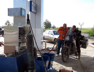 Bij een benzinestation in aanbouw zijn de technici druk de pompe aan het testen. "Als je 5 minuten hebt vullen we jullie tanken," wordt ons verteld. 1 liter voor 1 roebel, geeft de teller op de pomp aan. Maar dan blijkt dat een van de collega's op een rekenmachine de score bijhoudt en we uiteindelijk toch 25 roebel per lieter afrekenen. Is nog steeds niet veel. "Proost," zeggen we ter afscheid. We worden uitgezwaaid.