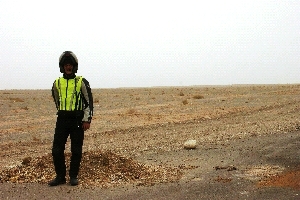 Er was meer activiteit in de woestijn dan wij verwacht hadden. De route ging voor het grootste deel over een vierbaansweg. Er zijn een paar locaties waar olie wordt geboord en er zijn meerdere cementfabrieken. Af en toe is een stukje woestijn ontgonnen waar graan verbouwd wordt waar naanbrood van wordt gemaakt. Ook staan er zelfs wat fruitbomen. We arriveerden in een groot dorp dat door de zandstorm er mistroostig uit zag.