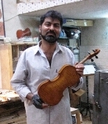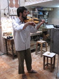 In een klein zijstraatje van de bazaar zie ik plots een aantal violen staan in een stoffige etalage. Het piepkleine winkeltje lijkt gesloten. Voorzichtig probeer ik beweging te krijgen in de getraliede deuren en tot mijn vreugde glijden ze open. Ik loop zacht naar binnen en zie een man geconcentreerd met een lintzaag de bovenplaat van een viool zagen. Hij schrikt wanneer hij mij in zijn ooghoeken opmerkt.