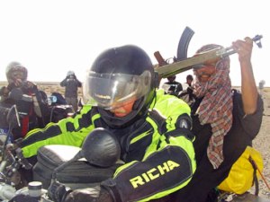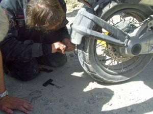 Zullig genoeg de motor later stuiteren op een scheef stuk terwijl ik stilstond, geen houden aan. Het zand van de valbeugels af en geen mens zit er iets van. Bij 1 van de vele wachtposten komt een soldaat erachter dat ik een dikke spijker in de band heb. Theo en Rob kunnen dat heel goed zodat ik mijn motorpak nog mooi schoon heb. Heb je gezien Dafne hoe smerig Rob er ondertussen bijloopt. Ik zou er even een sms aan wijden.