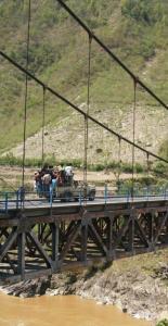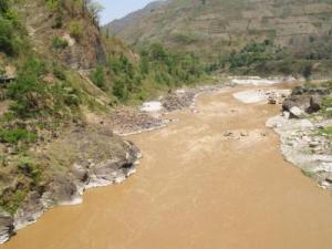 We rijden over een smalle, zeer bochtige tweebaansweg die soms erg goed en soms erg slecht is. Langs de weg een enorme brede rivier vol bruin, snelstromend water. Overal zijn er voor voetgangers slanke hangbruggen naar de andere kant. Het verkeer is minder hectisch dan in India omdat veel Nepalezen zich geen auto kunnen permitteren. Het zijn echte fietsers.