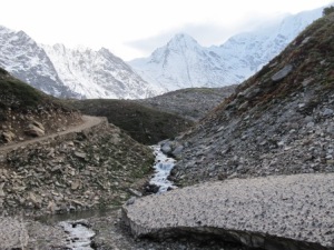 Leentje geeft het stuur weer over. Behalve de gaten, geulen, modderplekken en gravelstukken, rij ik ook het mooiste stuk weg van vandaag, omhoog de bergen in met witte besneeuwde toppen om ons heen, groene veldjes met reusachtige sparrenbomen en een klaterende rivier. Het hotel ziet er ook heel goed uit en ligt op een schitterende plek, op 3200 meter.
