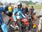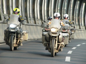 De motoren gaan veel sneller door het verkeer dan de auto dus alleen wanneer de weg leeg is en er geen snelheidscamera's zijn kan de auto een beetje in de buurt blijven. Niet dat het veel uitmaakt want de motorrijders moeten vaker stoppen om te tanken.