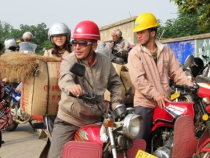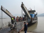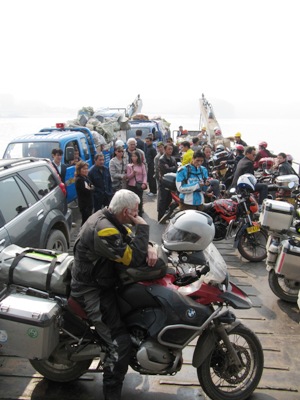 Vandaag begon de dag weer met een volgend avontuur, want er is weer een brug waar geen motoren overheen mogen. "Er is een veerpont voor voetgangers en motorfietsen," horen we, maar daar kunnen we niet veel mee. We spreken af dt we er met de auto ook heen rijden. Het lukt en behalve de motoren kan zelfs ook de auto mee. Daarna rijden we door het Chinese landschap, met kleine akkertjes vol groene groenten, bruin verdorde lotusplanten, veel rijstvelden maar ook theeplantages. Overal ligt rijst op de weg te drogen.