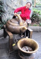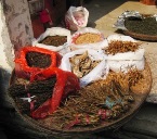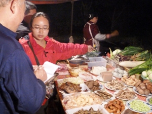 Samen met Chloe kijken we naar de uitgestalde ingredienten en overleggen dan met de ober of met de kok hoe het klaargemaakt gaat worden. Meestal bestellen we 2 vlees of visgerechten, 1 tofugerecht, 2 groentengrechten en rijst of noedels. Theo, Leentje en Erwin drinken "Pienda Pidjoo" (koud bier), John Colo (cola) en Sietjing, Chloe en ik "ChowCha" (hete groene thee).