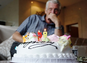 In de lobby van het hotel blaast Theo daarna de twee kaarsjes uit die samen het getal van zijn nieuwe leeftijd neerzetten. We bestellen er een kop koffie bij.