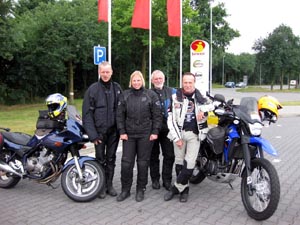 Ik rij evenlater op een prachtige XJ900F (zo eentje waar we vijf jaar mee op pad geweest zijn) naast Rob als we onderweg gaan naar het startpunt van de proloog naar St. Petersburg, net over de Duitse Grens. Wat ziet dat er heerlijk uit. Op de parkeerplaats staan de Diversion 600 van Marlies en de BMW's van Co en RobG en ook nog een derde, van Jaques, die volgend jaar meewil naar Peking. Pim en Piet zijn al een paar dagen geleden vertrokken en zullen ze in Tartu treffen, Nico vertrok gister en zal vanavond in Poznan zijn.
