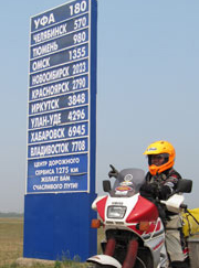 Nog een laatste stop voordat we de drukte van de stad Ufa ingaan. We verbazen ons er toch een beetje over dat bij de overgang naar deze deelrepubliek Bashkortorstan we in één keer twee tijdzones passeren. Ruud is in alle staten wanneer zijn GPS een sprong in de toekomst doet. Alle plaatsnamen staan hier in twee talen aangegeven; in het Bashkerisch en in het Russisch. "Gelukkig kunnen we het Russisch lezen," denk ik.