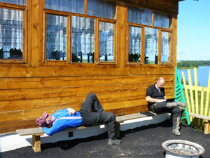We drinken koffie, genieten van de zon en pakken toch ook nog even de laptopjes erbij om een stukje te schrijven. Daarna varen we naar de overkant en dompelen ons onder in de heerlijkheid van Siberië; mooie uitzichten, onverharde wegen, kuddes paarden en koeien.