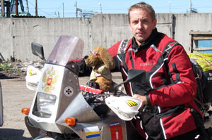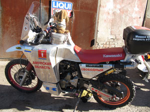 Bij aankomst bij de motorzaak maakten we kennis met Sergej, die duidelijk al het een en ander over ons van Pavel gehoord had. Hij rijdt op een prachtige KLR650 met eigenbouw alluminium 40 liter tank. Bovenop de tank zit het luchtfilter en daarop zit een plusche hond met zonnebril en flaporen. Sergej zet het contact aan, drukt op een knop en we horen muziek. Op de maat van de muziek gaan de oren van de hond omhoog.