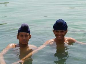 Je mag binnen geen schoenen dragen maar op het koele marmer loopt het prima. Ook moet iedereen een wit of geel hoofddoekje dragen. De mannen kleden zich uit tot op hun magere ondergoed en gaan met een ketting in het water, waarschijnlijk om niet te verdrinken.