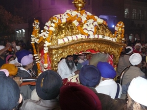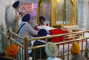 Voor de gelovige Sikh is het boek met de verzen, die tussen zonsopgang en -ondergang onafgebroken gelezen worden, het aller belangrijkste. Aan het eind van iedere dag 'gaat het boek slapen'. Rondom de draagbaar waarmee het boek naar zijn rustplaats gebracht wordt is het een gedrang van jewelste. Omdat voor de Sikh iedereen gelijk is, mag iedereen helpen dragen en dat wil dan ook iedereen. FotoRMT 2007.
