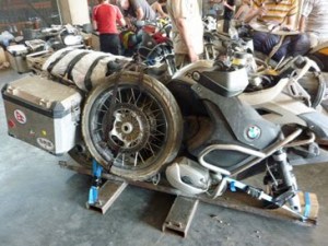 Daarna naar het hotel voor het ontbijt en de koffers ompakken want daarna zijn we naar het vliegveld gegaan om de motoren op frames te zetten. Een hele klus want scherm, spiegels, voorwiel, remklauwen moet eraf en dan maar zorgen dat je binnen de voorgeschreven afmetingen, volume dus en gewicht bleef. Maar met een GS lukt dat qua gewicht niet en de koffers kun je ook niet kwijt dus die maar laten zitten.